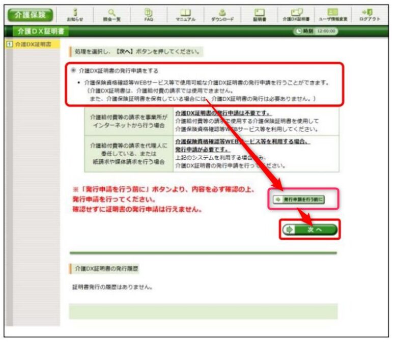 介護保険証明書の発行履歴がなかった場合、介護DX証明書のインストールを行います。