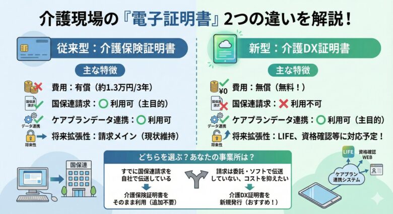 | 比較項目 | 介護保険証明書 | 介護DX証明書 |