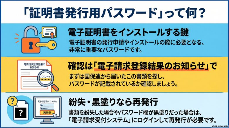 そのため、「電子請求登録結果に関するお知らせ」を紛失した場合と同様に、「証明書発行用パスワード」を再発行する必要があります。