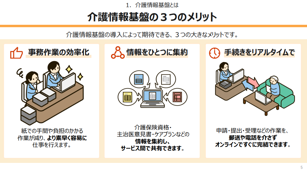 介護情報基盤の導入によって、介護現場では次の3つの大きな変化(メリット)が期待できます。