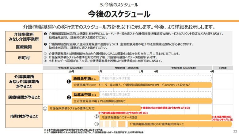 - 令和7年7月22日|介護情報基盤の今後のスケジュール、介護情報基盤活用のための介護事業所等への支援及び介護情報基盤とケアプランデータ連携システムの統合について