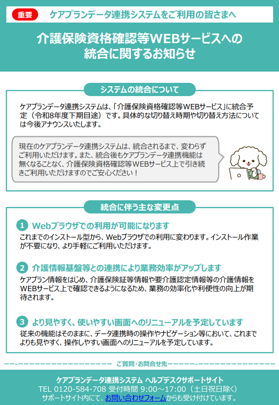 - 令和7年7月23日|【ケアプランデータ連携システムをご利用の皆さまへ】介護保険資格確認等WEBサービスへの統合に関するお知らせ