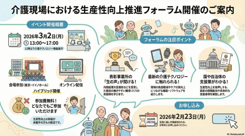 職場環境改善・生産性向上については、介護テクノロジーの導入、介護助手へのタスクシフト、AI活用による記録・計画業務の効率化等が強調され、特に中小事業所向けの支援が重要とされています。