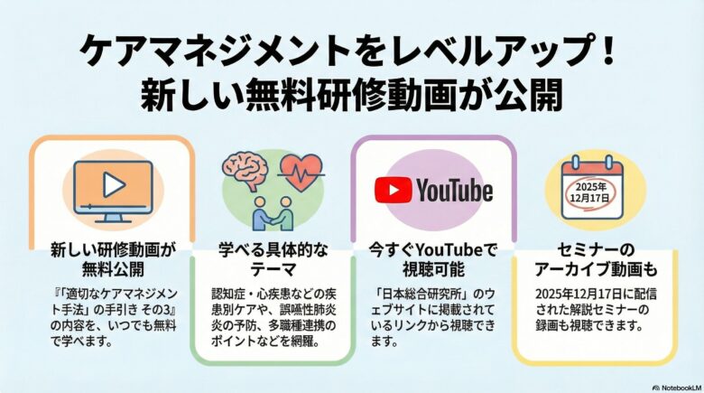 - 12月26日|Vol.1457|「適切なケアマネジメント手法の普及推進に向けた調査研究事業(令和7年度老人保健健康増進等事業)」における『「適切なケアマネジメント手法」の手引きその3』解説セミナーの解説動画等公開のご連絡について【その10】