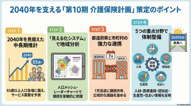 - 医療・介護連携、認知症ケア、介護予防を重視し、地域包括ケアシステムの深化を目指す