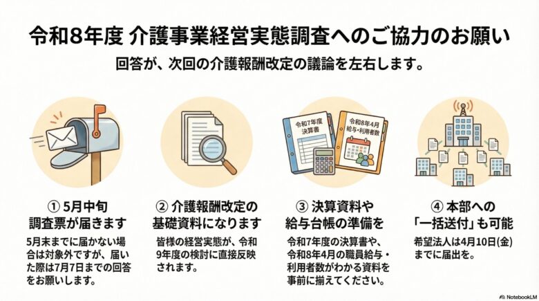 。この調査は、今後の介護報酬改定等の政策立案に不可欠な統計資料として用いられるもので、調査への積極的な参加が求められています。