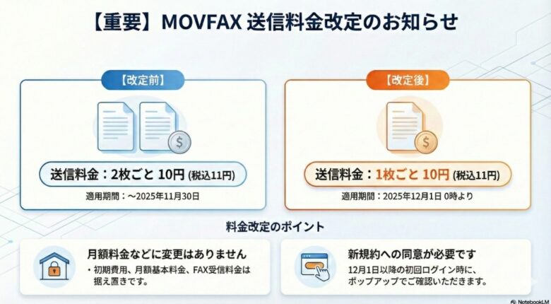- データ抹消: プラン変更に伴い、受信ステータス設定、アドレス帳の自動振り分け設定、共有フォルダ内のFAXデータなどが抹消される場合があるため、事前にダウンロードやバックアップを行うよう注意喚起されています。