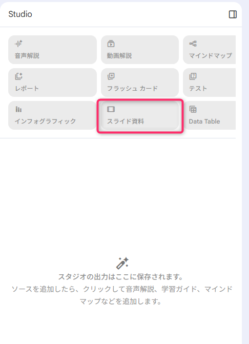 そして、今回の資料作成には、NotebookLMに用意されている「スライド資料」生成機能を使用しています。