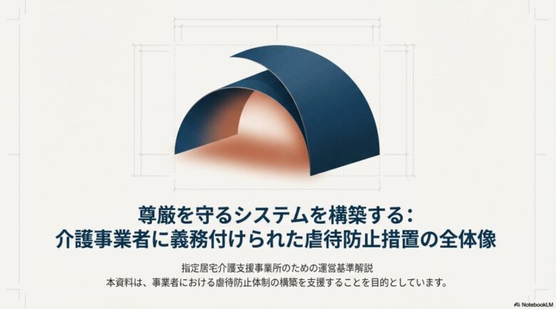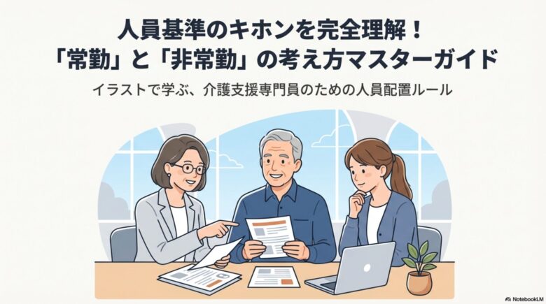 生成AI(NotebookLM)を活用したケアマネジャー向け業務資料集の表紙。「読むから見るへ」をテーマに、複雑な業務情報を視覚化・図解した資料であることを紹介。 AI活用
