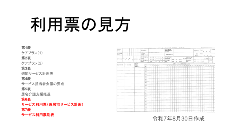 この資料は、介護保険の「利用票(別表)」の見方や関連ルールを解説した資料です。