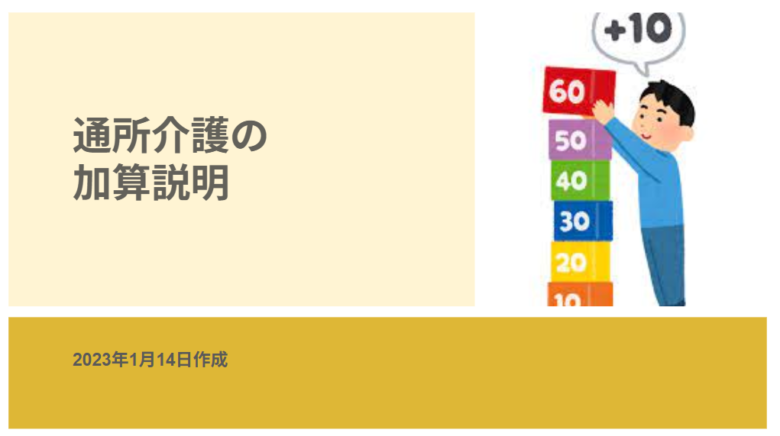 この資料は、通所介護における「加算」の種類や仕組みをわかりやすくまとめた解説書です。