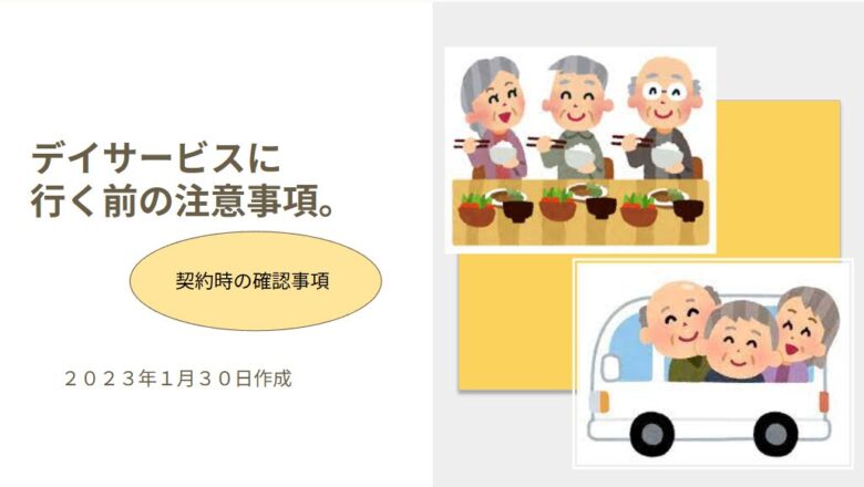 この資料は、デイサービスの種類や選び方、利用時の注意点をわかりやすく解説したものです。