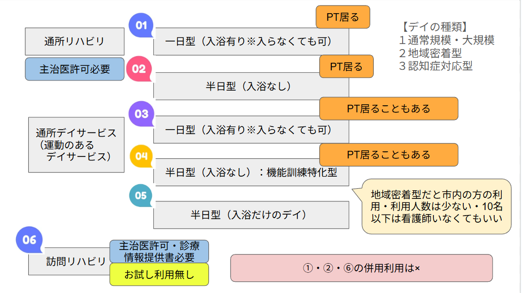 また、地域密着型や認知症対応型など多様な形態を紹介し、主治医の許可やお試し利用の可否など実務上の注意点も補足しています。