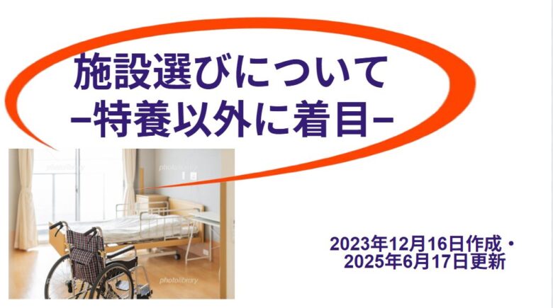 この資料は、介護施設の選び方、とくに特別養護老人ホーム(特養)への入所に焦点を当てて解説した内容です。