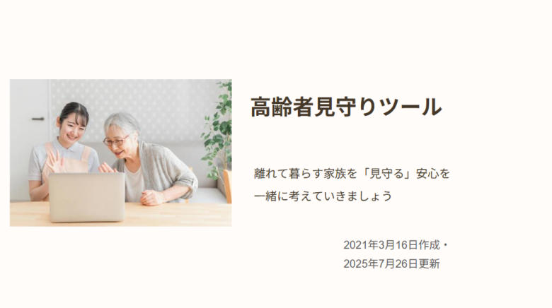 センサー、カメラ、アプリ、電話、宅配、訪問など多様な見守り手段を分類し、それぞれの特徴や利用場面を解説しています。