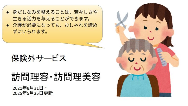 理容師・美容師が道具を持参して訪問し、カットやシャンプー、顔剃りなどを実施する仕組みを説明。介護資格は必須ではなく、保険外サービスである点を明記しています。