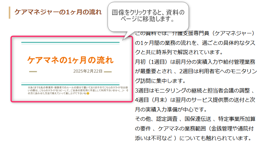 無償で公開しています。目的は、ケアマネジャーの複雑な知見を皆で再勉強すること、新人ケアマネジャーの離職者を一人でも減らすこと、先輩から新人さんへ教える際にイラストや言語化した情報で分かりやすく誤認なく漏れなく伝えたいこと。